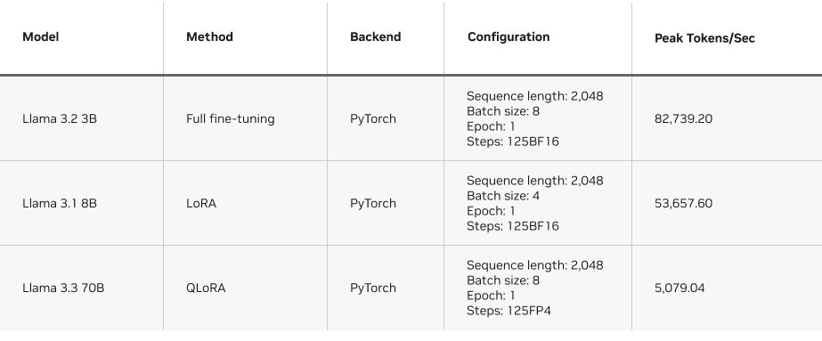The table below shows performance for fine-tuning the Llama family of models on DGX Spark.